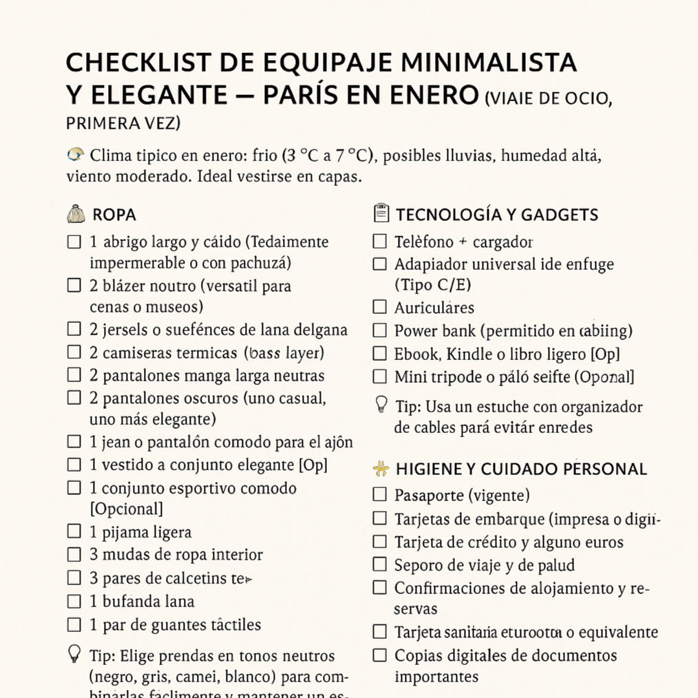 Esto es lo que recibirás: una checklist clara, útil y personalizada para tu viaje. Nada de listas genéricas que no aplican a tu destino, clima o estilo.